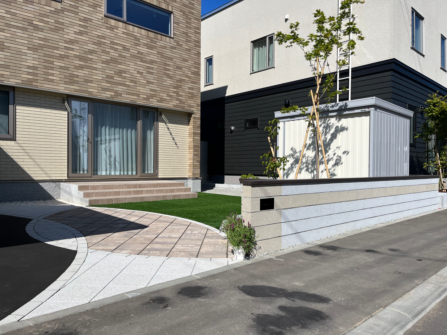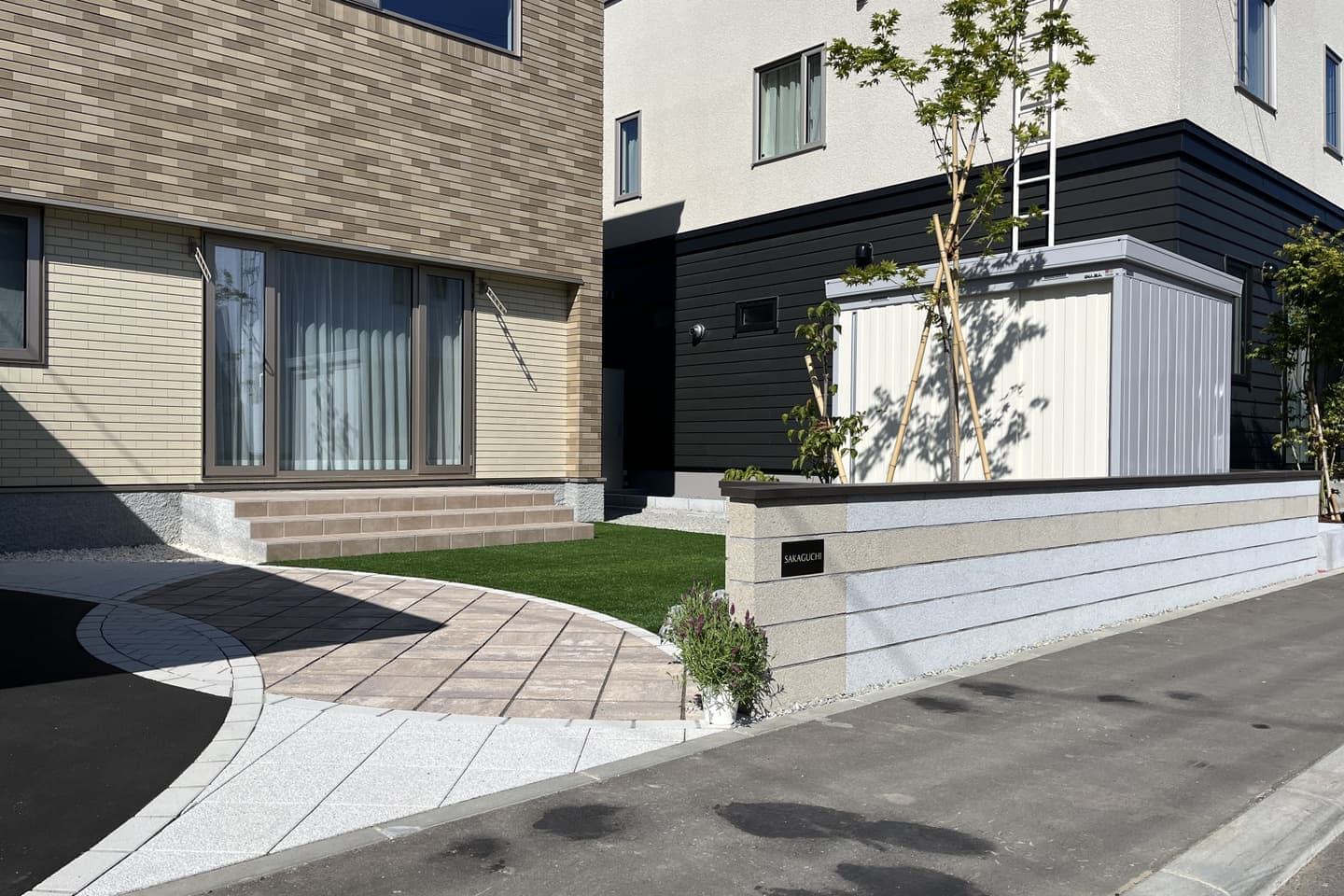 外構デザインプラン/アプローチ/ガーデン/庭園/化粧ブロック塀/コンクリート塀/門袖/ファサードフレーム/フェンス/土止め/ドッグラン/デッキ/パーゴラ/ライティング/植樹/人工芝/駐車場造成/各種舗装/カーポート/ガレージ/物置,etc.